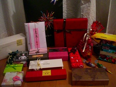 今年だんなさんが獲得したお客様と家族(もちろんわたしも!)からのチョコやプレゼント。