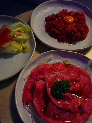 なんていう、ややこしいわたしなんですが、姉がおいしいユッケとお肉のお刺し身も用意してくれてました。